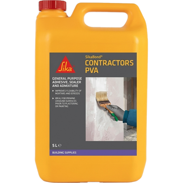 SikaBond® Contractors PVA (previously Everbuild® 506) is a multi-purpose agent, primer sealer, cement filler and plaster admixture that adheres to most common building and D.I.Y. materials except PVC and rubber. Ideal for priming unsound surfaces before plastering or painting, as an adhesive on wood, cork, textiles and most applications where at least one surface is porous, for general dust sealing on flaking paintwork/walls etc. and as a cement admixture.