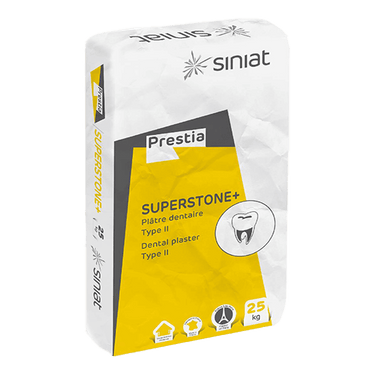 Le plâtre Prestia Superstone Plus de Siniat est un plâtre dentaire dur jaune de classe 3, formulé à partir de matériaux de gypse naturels.